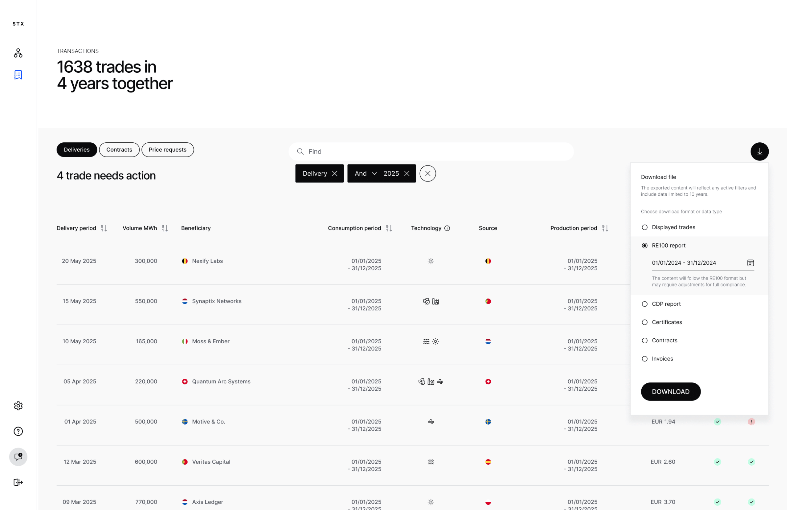 The STX Climate Tech platform is the single source of truth for Energy Attribute Certificates (EACs). It centralizes procurement, tracking and retirement, giving companies full visibility and control of their renewable energy strategy. By reducing manual work and consolidating complex portfolios, it helps organizations stay compliant, optimize Scope 2 reductions and evolve their climate goals worldwide with confidence.