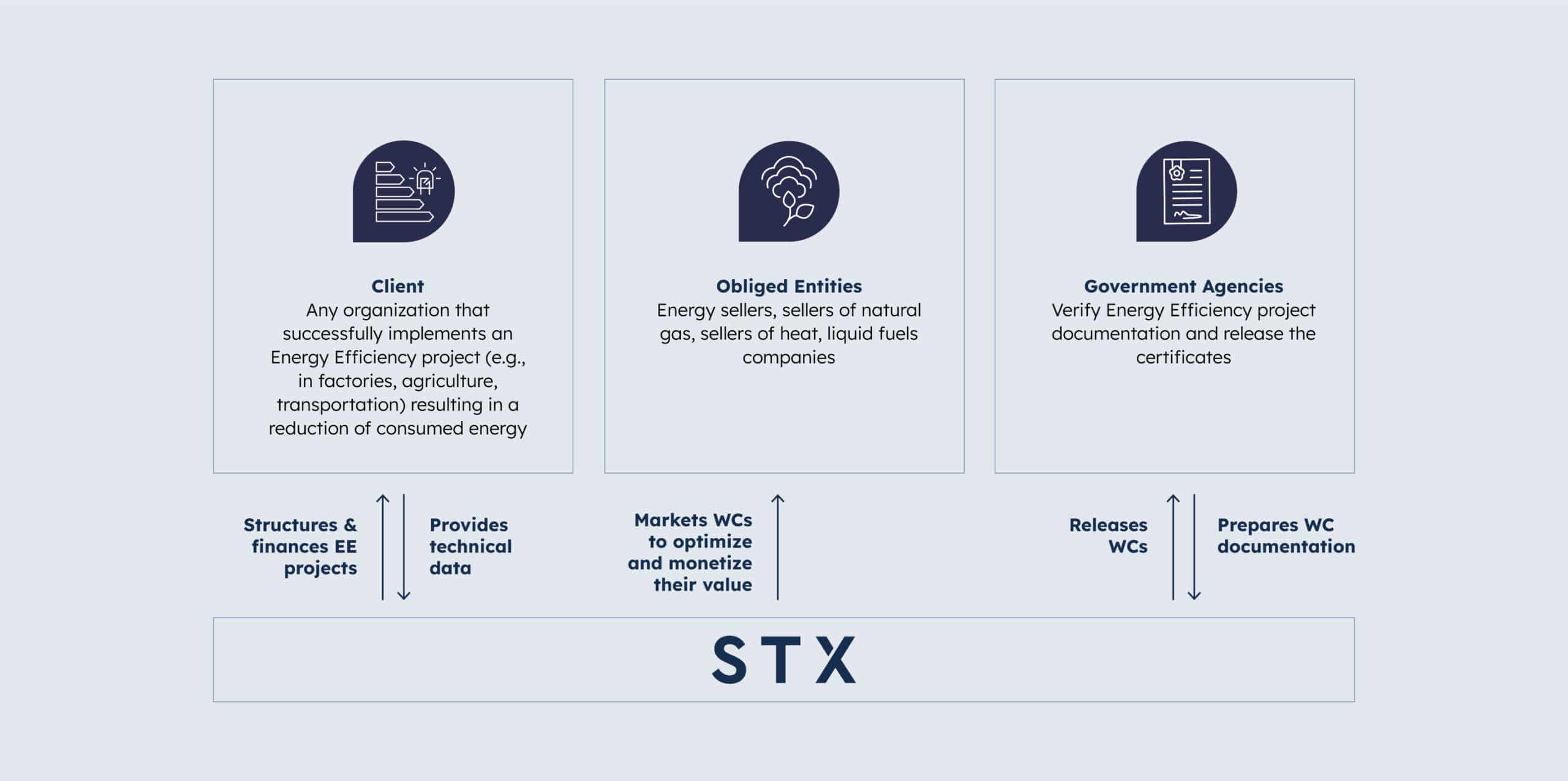 We support our clients in identifying, financing, certifying and monetizing energy-saving projects, ensuring liquidity, pricing transparency and regulatory alignment. Whether you’re an energy supplier, service provider or project developer, STX provides structured offtake solutions and access to a network of verified counterparties.
