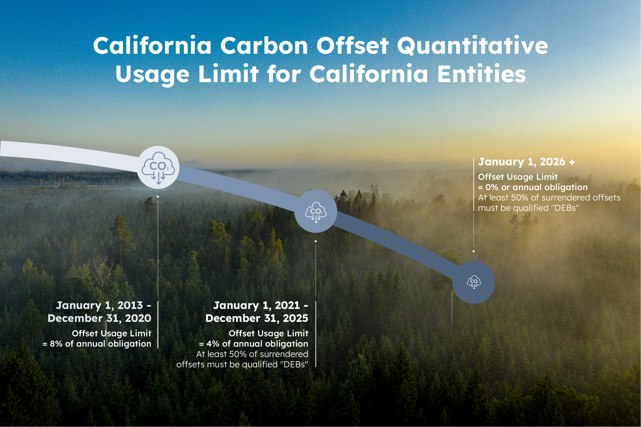 On top of annually surrendered allowances, entities may use CCOs to cover up to 4% of their annual emissions from 2021 to 2025, and up to 6% from 2026 to 2030. The California Air Resources Board (CARB) requires at least 50% of the offsets surrendered from each CA entity to be sourced from projects providing direct environmental benefits (DEB) to the state of California.