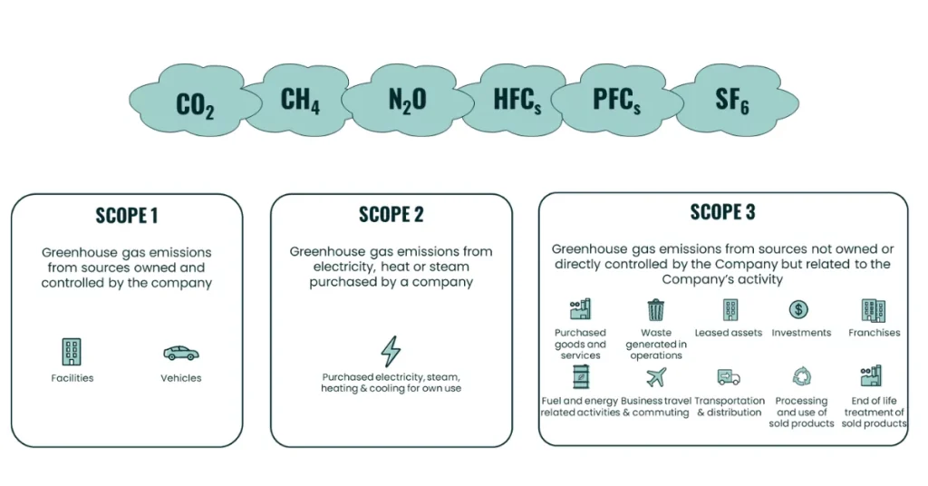 As mentioned, the first step of our climate action journey is to understand our impact in order to reduce it. First, we must select the GHG accounting standard, define boundaries and collect data, which we then use to calculate our emissions using emission factors. The next step is to verify our carbon footprint with a third-party certifier. Finally, we can disclose our emissions and our reduction progress. When calculating our carbon footprint we need to take into account scopes 1, 2 and 3 of an organization’s activity in the carbon footprint. Carbon emission activities can be divided into the following scopes: